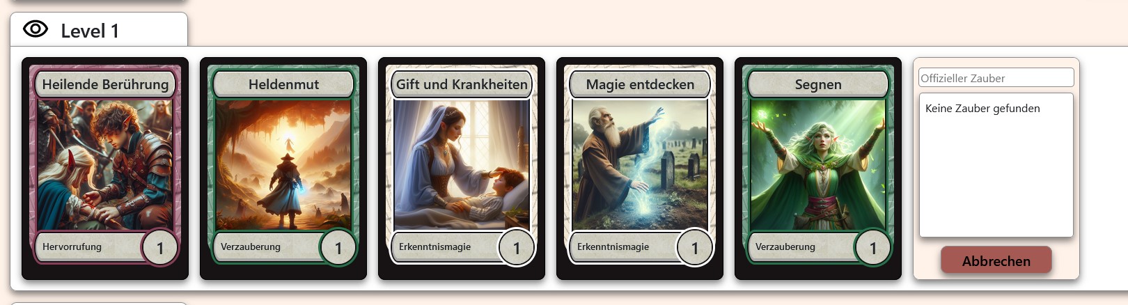 Hab nicht richtig gelesen. Level 1 Zauber sind noch nicht komplett implementiert. Bisher sind alle 70 Cantrips und die 1. und 2. Level Spells die ich als Klerikerin brauche implementiert. Schreib mir am besten eine Liste mit den Zaubern, die du verwendets, dann kann ich die zwischendurch mal einfügen.